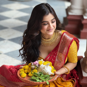 Draped in timeless red and gold, she blossoms like a goddess. Adorned with our handcrafted gold-plated sitahar and kada bangles, this look reflects divine tradition with soft femininity.