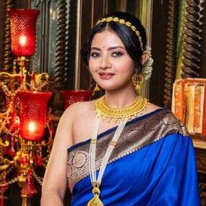 Our signature Maher necklace paired with a structured choker adds power to the poise of this stunning blue saree.
