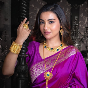 Our Pagoni earrings, chokers, and haath phool shine with rich vibrance against royal purple. This look is for the woman who enters the room with grace and leaves behind a legacy.
