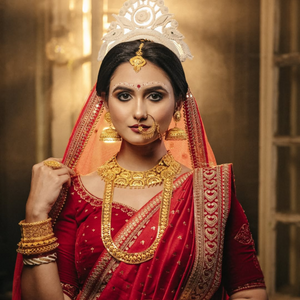 A vision of strength and beauty, our bride wears layers of gold-plated sitahar and bangles, echoing centuries of Bengali bridal tradition.